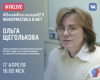 Проведёт онлайн-консультацию Ольга Щеголькова, учитель информатики и математики ГБОУ \”Школа № 1525\” г. Москвы, учитель высшей квалификационной категории, старший эксперт предметной комиссии по проверке ЕГЭ по информатике по городу Москве.Во время онлайн-консультации эксперт ответит на вопросы зрителей трансляции, а также расскажет, как лучше подойти к решению задания № 23, как оформить задачу 26, потратив меньше времени; стоит ли браться за задание 27, если не уверен в своих силах; на что нужно обратить внимание в задачах 24 и 25, чтобы не потерять баллы.Онлайн-консультация состоится 17 апреля с 16:00 до 17:00 часов по московскому времени.
