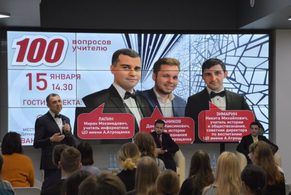 В этом году на встречу в детском технопарке «Кванториум» пришли три молодых специалиста Центра образования имени Александра Атрощанка: Даниил Сальников, учитель истории и обществознания, победитель конкурса «Знание. Премия» 2025 года и руководитель проекта «ТОТ», Мирон Лапин, учитель информатики, лауреат премии «Знание» 2024 года в номинации «Советник-просветитель» и Никита Зимарин, учитель истории и обществознания, советник директора по воспитанию.
