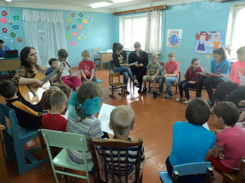 Я задумала совместить приятное с полезным: погостить у подруги, проведя несколько дней в деревне на лоне природы и одновременно поработать: провести музыкальные мероприятия в пришкольном летнем лагере, чтобы пополнить своё портфолио свидетельствами о моем вкладе в пропаганду гитарного искусства и воспитательную работу среди населения. Татьяна восприняла мое предложение с энтузиазмом, заранее опросила детей, какие песни, которые можно петь под гитару, им особенно нравятся. Прямо скажем, поначалу дети явно затруднялись с ответом, и список их любимых песен получился совсем уж коротким: «Голубой вагон» и «Черный ворон». Пришлось нам с Татьяной всю программу музыкальной гостиной готовить самим: написали, что сами знаем и помним, что обычно поют в лагерях и у костра. Так у нас набралось порядка 25 песен: из известных фильмов и мультфильмов, из наших знаменитых бардов: Олега Митяева, Юрия Визбора, Булата Окуджавы, Виктора Цоя и других авторов, которые учат настоящей дружбе и любви, преданности Родине, бережливому отношению к природе. Решили, пусть придут только те, кому действительно интересны песни под гитару, а также гитара как сольный инструмент. Как я выяснила, в школе есть дети, которые посещают музыкальную школу в Тоншаеве и также есть несколько человек, которые имеют дома гитары и пытаются освоить этот инструмент самостоятельно. Думала, соберется человек 10, попоем минут 30, чуть-чуть расскажу об истории гитары, сыграю пару сольных пьес – уже хорошо. Однако прием юной публики и заинтересованность ребят превзошла все мои ожидания. На встречу пришло не менее половины лагеря – дети разных возрастов, пели воодушевленно и энергично – наша гостиная шла без перерыва 2,5 часа. Перепели всё, что мы заготовили, ребята не расходились, предлагая спеть всё новые и новые песни. Даже известные шалуны, по обыкновению мешающие на занятиях, на этот раз все время сидели тихо, заворожено глядя на инструмент в моих руках. Мероприятие завершилось, когда всех позвали на полдник.
