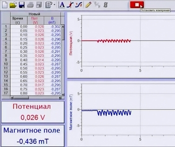Программа для сбора и анализа данных Logger Lite выводит данные в табличной и графической формах. Такое представление данных позволяет наглядно увидеть описанные выше взаимодействия токов и полей.