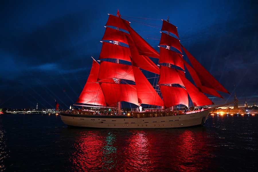 Праздник «Алые паруса» в первый летний месяц, в период белых ночей, ждут тысячи гостей и жителей Санкт-Петербурга. Во время грандиозного торжества зажигаются Ростральные колонны на Стрелке Васильевского острова. А на Неве появляется белоснежная бригантина под алыми парусами.