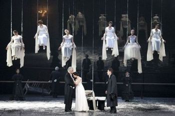 А над головами героев в это время высоко поднятые над сценой висели на веревочных качелях в позах ангелов в белоснежных платьях «московские жены». В предыдущей сцене эти жены были приехавшими в Москву невестами и двое мужланов, грубо их облапав, саблей отрезали им «символы девственности» – косы. Вот такая вот формулировалась «сэлявуха» – современная «семейная нравственность».