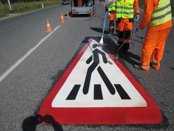 Примечательно, что установка знаков не требует привлечения специальной техники и производится с минимальным нарушением трафика. Сама технология нанесения знаков базируется на сплавлении термопластика с асфальтом при высокой температуре плавления. Нанесение знаков производится при помощи газовой горелки. Готовый знак размещается на асфальте, а затем при помощи нагревания до 220 градусов Цельсия приплавляется к асфальтовому покрытию.