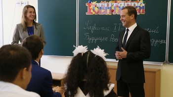 В День знаний председатель Правительства РФ Дмитрий Медведев посетил среднюю школу №34 в Подольске. Глава кабмина поздравил учеников и преподавателей с началом нового учебного года, осмотрел здание новой школы и посетил несколько уроков.