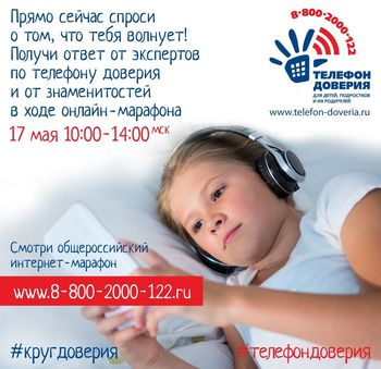 Также продолжается флэшмоб в поддержку телефона доверия 8-800-2000-122, который был запущен в ходе подготовки к марафону в социальных сетях \”Инстаграм\” и \”ВКонтакте\”. Узнать подробнее о флэшмобе, а также принять участие в творческом конкурсе \”Активируй доверие\”, победители которого будут объявлены в прямом эфире 17 мая, можно на сайте www.8-800-2000-122.ru.