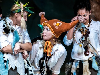 Спектакль брызжет искрами остроумия, изобилуя многочисленными находками богатой фантазии постановщика. Так, фоном для важного разговора Женщины с Котом в пещере служат азартные скачки троицы «охотников» – Мужчины, Собаки, Лошади, создавая контраст и забавный напоминая, что серьезное в жизни часто соседствует или сопровождается смешным. А чего стоит, к примеру, сцена, когда Корова обнаруживает обглоданную кость своего возлюбленного быка Степы, вздыхая с тоской Гамлета над черепом «бедного Йорика». Или шутовская пантомима – приход грозной Паучихи (Александр Щелканов) за своим похищенным детенышем. Да разве перечислишь все?