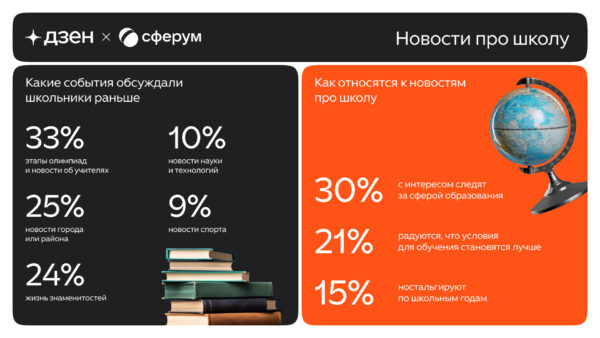 В годы учебы россиян чаще всего интересовали события самой школы: этапы олимпиад и новости об учителях отметили 33% опрошенных. 25% респондентов признались, что с интересом обсуждали новости города или района. Почти столько же (24%) в школьные годы больше интересовались жизнью знаменитостей и лидеров мнений. Новости спорта в период учёбы оказались в фокусе лишь у 9% россиян, а науки и технологий — у 10%.
