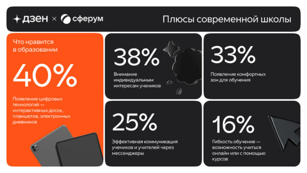 По мнению большинства опрошенных, современные школы заметно изменились в лучшую сторону. Чаще всего респонденты отмечали использование цифровых технологий — интерактивных досок, планшетов, электронных дневников и других инструментов (40%). Почти столько же (38%) опрошенных считают, что сегодня в школах больше внимания уделяют индивидуальным интересам учеников и практической направленности программ.