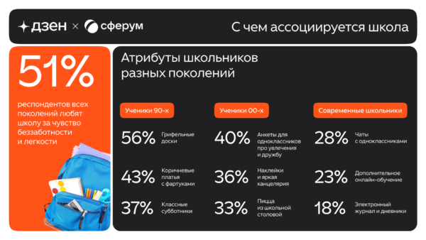 К началу нового учебного года информационная платформа Дзен и коммуникационный сервис Сферум провели исследование, чтобы выяснить, какие предметы и детали школьной жизни вызывают у россиян ностальгию. Аналитики рассказали, с чем ассоциируется школа у современных школьников, а также у представителей поколений 2010-х, 2000-х и 1990-х годов.