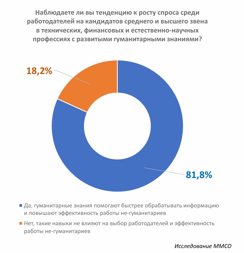 Спрос на специалистов с развитыми гуманитарными знаниями растет в технических, финансовых, естественно-научных и производственных отраслях, показало исследование Московского международного салона образования (ММСО), в котором приняли участие 320 специалистов по подбору персонала и руководителей кадровых служб крупных компаний. Сильные гуманитарные знания и начитанность помогают сотрудникам независимо от сферы быстрее обрабатывать информацию и повышают общую эффективность их работы, констатировали 82% опрошенных.