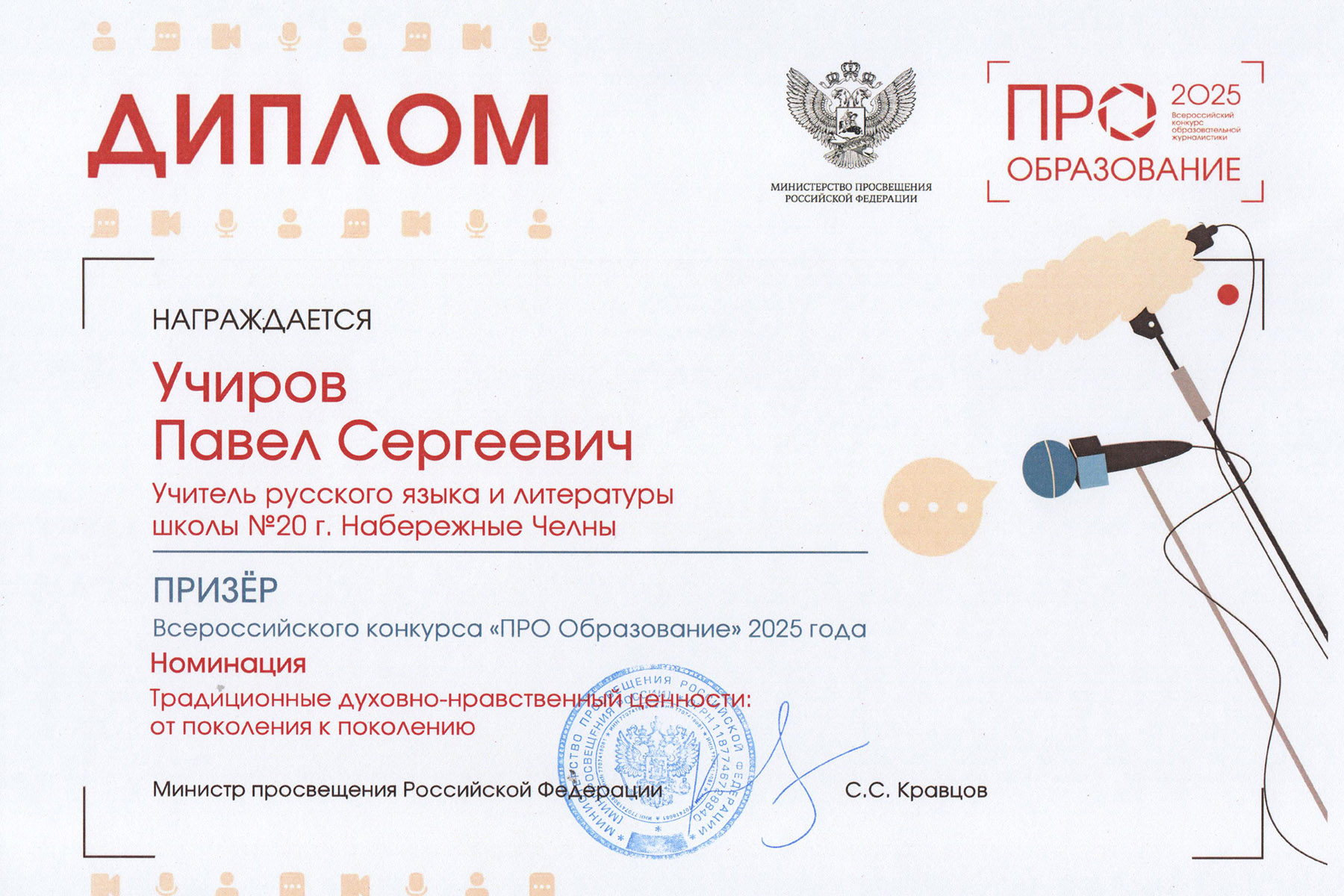 На конкурс было прислано 4500 работ со всей России, которые сражались за победу в 17 номинациях. Среди награжденных есть и наш автор. Заявка Павла Сергеевича Учирова включала в себя серию статей в «Учительской газете» о челнинском образовании. Работы «Воспитанники Поста №1 города Набережные Челны 50 лет несут Вахту Памяти» и «Почему важно общаться с гениями? Школьники встретились с учителем химии Ларисой Шилиной» не оставили экспертов равнодушными и позволили стать Павлу Сергеевичу призером конкурса в номинации «Традиционные духовно-нравственные ценности: от поколения к поколению».