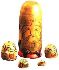 Первая русская матрешка была выточена и расписана в московской игрушечной мастерской только в 90-х годах XIX века, по образцу, привезенному из Японии. Этот японский образец, выполненный с большим юмором, представлял собой множество вставляемых друг в друга фигурок японского мудреца Фукурума – лысоватого старичка с головой вытянутой вверх от многочисленных раздумий.