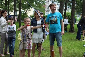 Также на площадке происходили состязания по стрельбе из лука и метанию настоящих топоров. Шестилетний Дима Попов уверенно метнул тяжелый топор и сразу попал в цель.