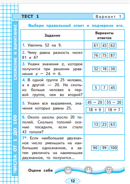 Каждый тест представлен в двух одинаковых по трудности вариантах. К каждому тестовому заданию предлагается несколько вариантов ответа (2-4 класс). А в сборнике тестовых заданий для первого класса задания представлены в двух видах: с открытым ответом (ученик сам записывает верный ответ или выполняет геометрические построения) и с выбором верного ответа из нескольких.