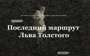 Мультимедийный проект \”Последний маршрут Льва Толстого\” расположен по ссылке http://thelastrouteoftolstoy.tilda.ws. Он содержит интерактивную карту, а также хронологию событий, происходивших в этот день ровно 107 лет назад.