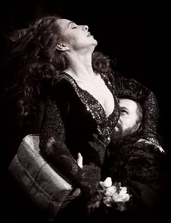 Центром сюжета вопреки названию становится «камелия» Настасья Филипповна (Екатерина Гусева), чья необыкновенная привлекательность подчеркнута роскошными платьями художницы Виктории Севрюковой. Героиня страдает от презрения общества в лице развратного богатого господина Тоцкого (Геннадий Коротков), чьей содержанкой она была, вальяжного генерала Епанчина (Анатолий Васильев), подлого, хотя и гордого Гани Иволгина (Нил Кропалов) и его домашних – добродетельной матери (Марина Кондратьева) и откровенно-прямой сестры (Яна Львова). Обаятельную и женственную Екатерину Гусеву непривычно видеть в образе фам фаталь, да и самой актрисе явно неуютно играть необузданный характер, но она находит свою краску для решения роли: ее персонаж – женщина с большим сердцем, жаждущая чистой верной любви.