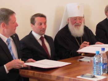 Организаторами конференции выступили Новгородский государственный университет имени Ярослава Мудрого, Новгородская Митрополия Русской Православной Церкви, Администрация Новгородской области, Международная академия наук педагогического образования. Никитские чтения традиционно посвящены исследованию связей между православием и основными видами русского искусства и педагогики. Среди участников конференции, заинтересованных этой темой – представители высших и общеобразовательных учебных заведений, а также научных сообществ из Хорватии, Финляндии, Беларуси, Украины и 17 городов России. Нынешние Никитские чтения знаменательны тем, что в рамках этого мероприятия состоялось подписание соглашения о сотрудничестве между Новгородской Митрополией РПЦ и Комитетом образования, науки и молодежной политики Новгородской области. Соглашение направлено на объединение усилий в отношении духовно-нравственного воспитания подрастающего поколения. Напомним, «УГ» писала, что накануне, 11 мая, мэрия Москвы и Русская православная церковь заключили аналогичное соглашение о сотрудничестве в целях духовно-нравственного просвещения школьников. Председатель комитета образования, науки и молодежной политики Новгородской области Анатолий Осипов высказал на конференции свое положительное отношение к введению в школах предмета «Основы религиозных культур и светской этики». Он отметил, что в Новгородской области в порядке эксперимента с 1 апреля 2012 года курс «Основы религиозных культур и светской этики» уже введен в 10 общеобразовательных учреждениях. При этом все учащиеся, пользуясь правом на свободный выбор, предпочли модуль «Основы православной культуры». А с 1 сентября 2012 года такой курс будет введен во всех четвертых классах общеобразовательных учреждений. Новгородской области. Фото автора: Митрополит Новгородский и Старорусский Лев и председатель комитета образования, науки и молодежной политики Новгородской области А.А.Осипов во время подписания соглашения о сотрудничестве между Новгородской Митрополией РПЦ и комитетом образования, науки и молодежной политики Новгородской области.