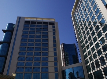 15-этажное здание РМОУ высотой 70 метров возведено в самом центре курорта Сочи. Внешний облик современного кампуса удачно вписан в архитектуру приморского города, в цветовой гамме фасада преобладают оттенки белого и синего цветов, а облицовка выполнена из прозрачного и тонированного, зеркального стекла.