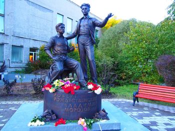 Помимо главы региона в церемонии открытия монумента приняли участие дочь Роберта Рождественского Екатерина, младшая сестра Владимира Морозова Татьяна Красовицкая, десятки жителей а, в том числе школьники, участники студии художественного слова Лидии Побединской.Авторами памятника, отлитого в бронзе, выступили московские скульпторы Дарья Успенская и Виталий Шанов. Первоначальный замысел создателей был таков: изобразить двух поэтов, сидящих на ступенях крыльца ого госуниверситета. В карельском вузе Роберт Рождественский проучился один год. Из-за невозможности демонтировать ворота вуза, монумент уставили возле филармонии. Памятник изготовлен и установлен за счет внебюджетных средств, привлеченных международным центром \”Слава\”.Стоит отметить, что идея увековечить память о поэтах родилась у Иосифа Кабзона. Поддержали ее Василий Лановой и дочь Роберта Рождественского Екатерина.\”Я счастлива, что я здесь, в Карелии, что рядом со мной и с вами мой отец. И он не один. Есть такие моменты в жизни, которые можно назвать большим счастьем. Сегодня для меня это так\”, — сказала Екатерина Рождественская на церемонии открытия. Установку памятника не все горожане восприняли однозначно. Некоторое петрозаводчане отмечают, что монумент не освещен и в темное время суток его не видно, другие — что небрежно уложена тротуарная плитка.- Памятник архаичный, не зря его прозвали \”Минин и Пожарский\”, — говорит филолог из а Наталья Полевая. — А ведь оба поэта были новаторами! Вчера специально ходила днём его рассматривать, увидела, что он очень небрежно отлит, не в пример памятнику Петру I, который стоит на набережной Онежского озера.Роберт Рождественский жил в юные годы в столице Карелии, учился в ом университете, здесь были изданы его первые взрослые стихи. Владимир Морозов — карельский поэт, жизнь которого трагически оборвалась на взлете творчества. Поэты познакомились в годы учебы в Литературном институте в Москве. На открытии памятника присутствовали ученики школы №9 а, выпускником которой был Владимир Морозов. В то время школа была мужской, \”гвардейской\”, учились здесь только мальчики.- Образование было десятилетним. В том выпуске было пять медалистов: четыре серебряных, один золотой, — рассказывает учитель русского и литературы, завуч школы №9 Сергей Невский. — Владимир Морозов по большинству предметов имел тройки. Была в аттестате поэта всего одна пятерка – по литературе. Это не удивительно, ведь первые стихотворения Владимира были напечатаны на страницах комсомольской газеты республики \”Молодой большевик\”, когда он учился в девятом классе.На литературно-музыкальном вечере, посвященном творческому наследию Роберта Рождественского и Владимира Морозова, состоялся премьерный показ художественного видео, созданного по заказу Правительства Республики Карелия Киностудией \”Резон\” при поддержке Союза кинематографистов Карелии. Строки из поэмы Владимира Морозова \”Долина смерти\” прочла заслуженная артистка Карелии Виктория Федорова.- Когда режиссеры Константин Ленчицкий и Алексей Бабенко пришли в нашу школу, чтобы снимать документальный видеосюжет на стихи Владимира Морозова, то удивились – поэт здесь учился! Они пришли только потому, что школа подходила для съемок. Из Музея истории школы принесли парту тех времен,