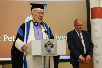 Выдающийся американский биолог и генетик, лауреат Нобелевской премии Джеймс Уотсон получил мантию почетного доктора СПбГУ. Это звание присваивается выдающимся деятелям науки, образования и культуры, государственным и общественным деятелям, внесшим вклад в развитие международного научного, культурного, экономического и политического сотрудничества.