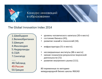 Если взглянуть на рейтинг стран по уровню развития инноваций в образовании, то, как отметила директор Конкурса инноваций в образовании Диана Королева, в 2014 году Россия заняла там 49 место – между Таиландом и Грецией. Среди проблемных областей, которые мешают отечественному образованию взять еще более высокую планку, эксперты называют затруднения в развитии внутреннего рынка, несовершенство институтов, низкие показатели творческой деятельности, инфраструктурные проблемы и т.д. Тем не менее, в минувшем году результат нашей страны был гораздо лучше, чем годом ранее, когда Россия оказалась в рейтинге ниже на 13 пунктов.
