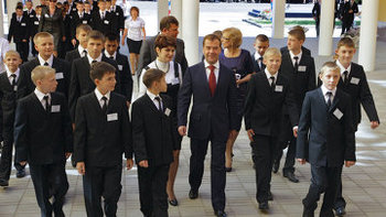 Затем Медведев побывал в новом классе – фотолаборатории. Оборудование для этого класса президент страны преподнес училищу в подарок. Он кратко побеседовал с воспитанниками, обменявшись мнениями относительно искусства фотографии. \”Сегодня фотография стала более демократичной, чем 20-30 лет назад\”, – считает президент, который и сам часто берет фотокамеру в руки.