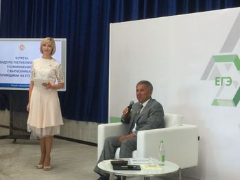 Мероприятия августовского педагогического совещания в Республике Татарстан продолжаются. Сегодня утром в лицее \”Иннополис\” прошла встреча президента Татарстана Рустама Минниханова с выпускниками школ региона, получившими сто баллов на ЕГЭ. В этом году их 117. У двоих высший балл по двум предметам, еще двое ребят стали стобалльниками сразу по итогам трех испытаний. Встречу вела заместитель директора лицея, абсолютный победитель конкурса \”Учитель года России\” – 2014 Алла Головенькина. Во встрече также принимал участие главный редактор \”Учительской газеты\” Петр Положевец.