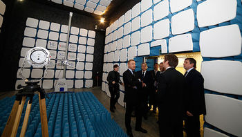 Дмитрий Ливанов увидел принцип работы уникальной для России безэховой камеры, где проходят исследования электромагнитной совместимости радиоэлектронных устройств и телекоммуникационных систем, измерение электромагнитного излучения радиоэлектронных приборов и исследование устойчивости работы радиоустройств в мощном электромагнитном поле.