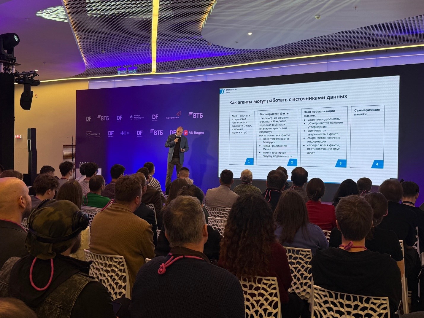 Программа была насыщенной: десятки сессий, практические кейсы, дискуссии и встречи. Здесь же подвели итоги Data Fusion Contest — соревнования по машинному обучению, где команды работали с прикладными задачами и показывали, как теоретические решения применяются на практике.