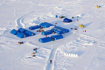 Российские ученые высадились на лед в районе 89 градуса северной широты и 20 градуса восточной долготы. Здесь они оборудуют дрейфующую станцию \”Северный полюс – 2015\”.