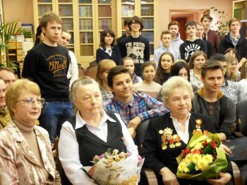 В этот раз в гости к ребятам пришли: председатель общественной организации бывших несовершеннолетних узников нацистских концлагерей Невского района Ольга Прохорова и бывшая несовершеннолетняя узница нацистского лагеря Валентина Ваканина. Ольга Георгиевна рассказала, как вся ее семья, родом из Лужского района Ленинградской области, была угнана сначала в Германию, а потом в Австрию. Детей, а их было четверо, вместе с мамой везли в так называемых \”телятниках\” – вагонах, в которых перевозили скот. Несколько суток люди были вынуждены ехать стоя, поскольку вагоны набивались битком. По приезде в концлагерь Дахау пленники несколько месяцев жили на полях рядом с лагерем, поскольку мест для них не было. Кормили из рук вон плохо. К окончанию войны, пройдя ужасы концлагерей, девочка 6-ти с небольшим лет весила 28 килограммов. Но жизнь, как считает Ольга Георгиевна, все-таки была к ней благосклонна, потому что, несмотря на нечеловеческие условия, вся ее семья выжила и вернулась на родину.