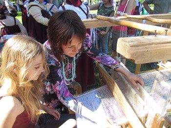 Дети особенно охотно участвовали в мастер-классах, а таковых здесь было организовано множество – по изготовлению лыковой и текстильной куклы, плетению из бересты и кружевоплетению на коклюшках, ткачеству, росписи по дереву, лепке из глины, работе на гончарном круге. Многие из мастеров, обучавших желающих своему искусству, являются преподавателями системы дополнительного образования Новгородской области. Так, коллектив педагогов Центра ремесел из маленького поселка Пола приехал на праздник со своими ткацкими станками и запасом материалов для изготовления традиционных тканых половиков. В поселке Пола всего две общеобразовательных школы, и Центр ремесел для большинства учащихся – то место, где они проводят вторую половину дня, бесплатно обучаясь в разнообразных кружках видам декоративно-прикладного искусства. Интересно, что половики, которые умеют ткать многие школьники из Полы, имеют «фирменный» знак поселка – вытканный на них ромб является традиционным узором данной местности. В Новгородской области приемы старых мастеров не забываются, не уходят в прошлое: их есть кому передать!