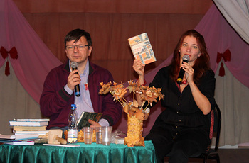 После теплой беседы ребята окружили знатоков их детских сердец плотным кольцом, каждый хотел задать вопросы авторам любимых произведений лично, а еще подписать приобретенные на встрече с писателями книги. Сквозь шумную стайку ребят удалось и нам подобраться к Андрею и Евгении и тоже взять автограф для читателей \”Учительской газеты\”. А далее этот творческий союз отправился на встречу со школьниками Печоры и Воркуты.
