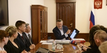 Встреча школьников и губернатора началась в рабочем кабинете Александра Дрозденко. Он рассказал ребятам о рабочем графике губернатора, о структуре областного правительства, о планах по развитию региона, показал, каков ежедневный документооборот, как помогает ему в работе айпад и т.д.