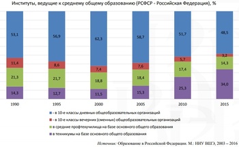 Впрочем, свою роль здесь сыграло и то, что в этот период институциональное разнообразие системы образования заметно обеднело. Вечерняя школа фактически деградировала, а с ней исчез и тот особый кластер образовательных организаций, позволяющих взрослым получить законченное общее среднее образование. Психологи считают, что получить базовое образование лучше всего до 24 лет, и если ты этого не сделал, дальше будет гораздо сложнее…