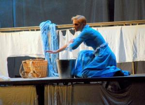 Нежелание идти было таким сильным, что на спектакль я попала с пятнадцатиминутным опозданием. На сцене шла «Гроза». Нет, до самой грозы было еще далеко – в зрительный зал я попала в начале первого действия, во время диалога Кулигина с Борисом Григорьевичем. Заранее скучая и приготовившись терпеть («работа есть работа»), я стала смотреть на сцену. Декорации были исполнены в необычном, так сказать авангардном стиле. На нескольких поперечных ярусах развешено было нечеловеческих размеров белое белье – простыни, рубахи, штаны, причем висели они так плотно, почти без просветов, что создавалось впечатление глухих стен или заборов. Но я недолго анализировала декор – меня отвлек монолог Бориса.
