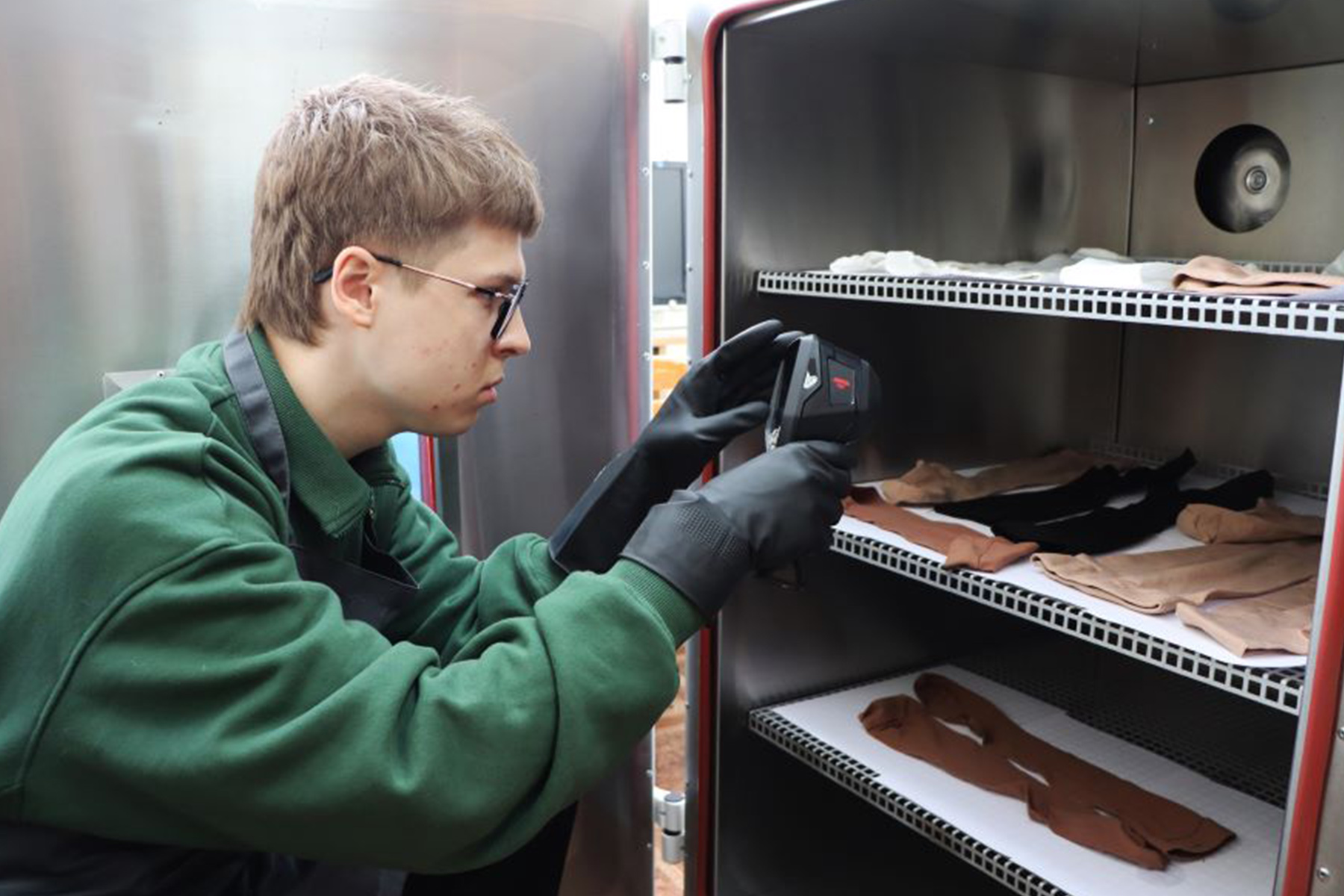 Обычный компрессионный трикотаж из-за плотной ткани нарушает естественный теплообмен, что приводит к перегреву, зуду и раздражению кожи. В результате, пациенты преждевременно отказываются от ношения данных изделий. Молодой исследователь разработал умный трикотаж, который не только оказывает лечебное давление, но и автоматически регулирует температуру кожи ног. Даниил Силантьев внедрил в структуру ткани «умные» микрокапсулы, материал пропитывается специальной эмульсией, содержащей вещества с фазовым переходом (PCM).