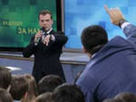 Президент РФ Дмитрий Медведев приехал в МГУ на вторую встречу со студентами журфака, перед общением с главой государства специально созданный для этого студенческий оргкомитет провел инструктаж о правилах поведения.