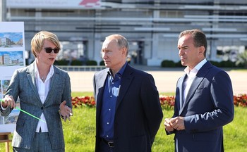 Президент РФ Владимир Путин вместе с губернатором Краснодарского края Вениамином Кондратьевым и руководителем фонда \”Талант и успех\” Еленой Шмелевой посетил 10 мая ряд объектов образовательного центра \”Сириус\”.