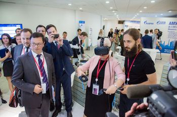 На стенде \”Технопарка Русский\” Ольга Васильева примерила шлем виртуальной реальности и с его помощью осмотрела настоящую ветряную электростанцию, которая находится в Голландии.