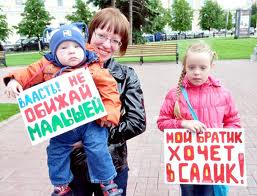 «Государству нужны дети? Детям нужны детсады!». Малыши стояли с белыми шариками с надписями «Я хочу в детский сад». Чтобы не было скучно, ребята пускали мыльные пузыри, которые привлекали внимание всех проходящих к необычной акции.