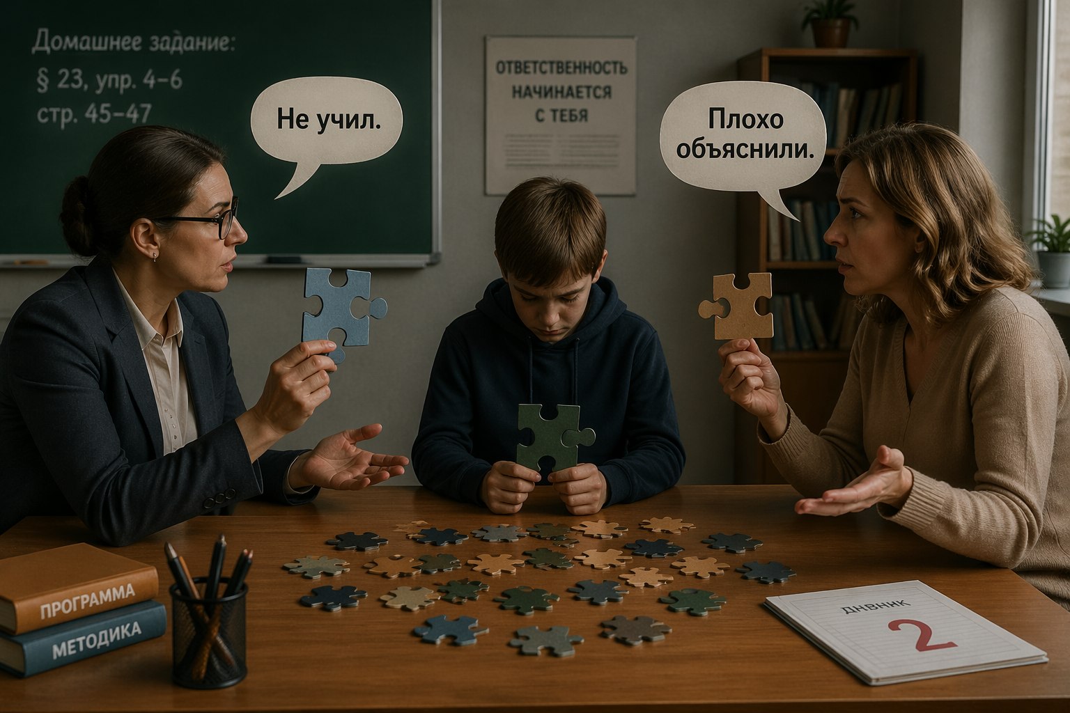 Представим стандартную ситуацию, которую можно наблюдать в любой школе. Ребёнок получил двойку (или другую оценку ниже ожиданий родителя). Учитель говорит: «Не учил». Родитель отвечает: «Плохо объяснили». Ребёнок молчит и смотрит в пол. Все трое по-своему правы, и никто не готов взять ответственность за результат. Каждый держит кусок пазла, но картинки нет.
