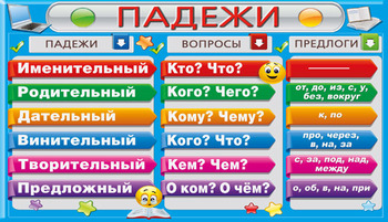 А что вы знаете о падежах? (В русском языке 6 падежей, И.,Р., Д., В., Т., П., у которых есть вопросы и слова – помощники).