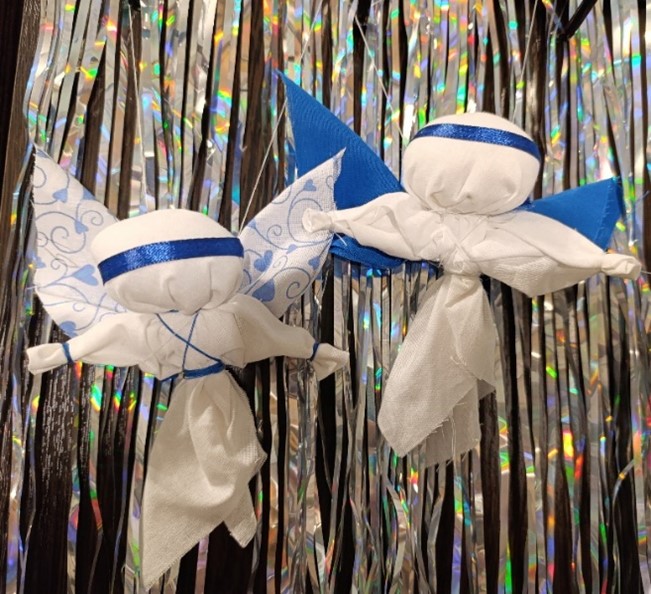 Педагог может продлить интерес к народной игрушке, предложить развить сюжет игры, изготовить новые игрушки: птичку, зайчика из лоскутков ткани завязывая на ткани узелки, создать персонажей к сказкам. В зависимости от того, как будет протянут узелок – длинно, широко, округло – тем самым будет меняться образ. Таким образом, можно создать любых животных и организовать не только сюжетные, но и театрализованные игры. Ещё можно изготовить подарок к Новому году, ангелочков из ткани – новогодний елочный оберег.