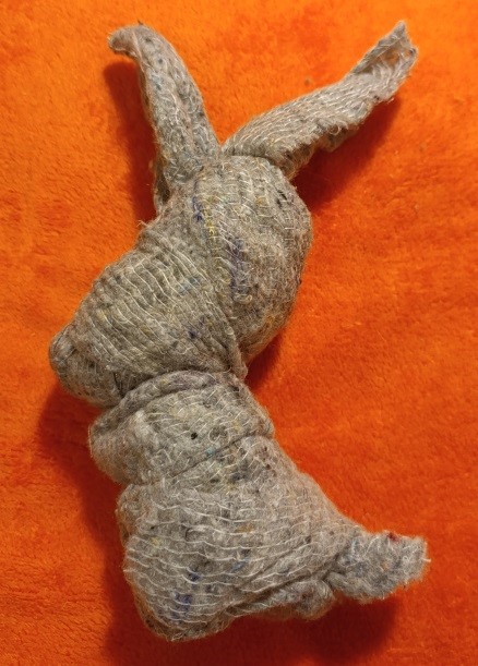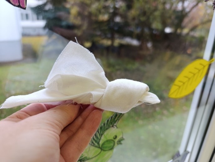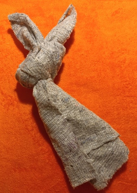 Делаем узел наверху – формируем голову и ушки. Завязываем ткань снизу, под шеей, формируем туловище, вытягиваем хвост. Зайчик готов!