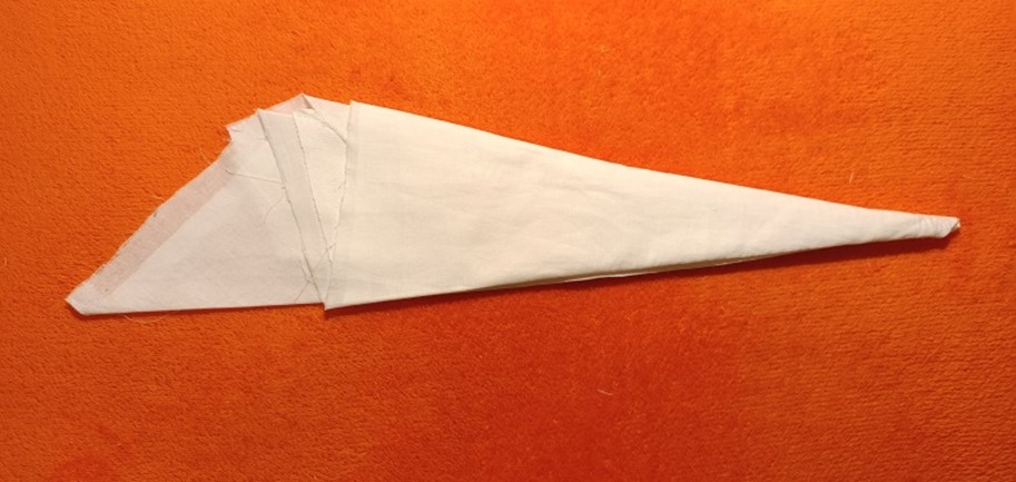 Складываем верхний угол, далее складываем ткань по образцу внутрь, как показано на фото.