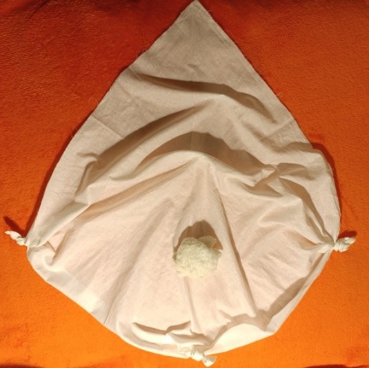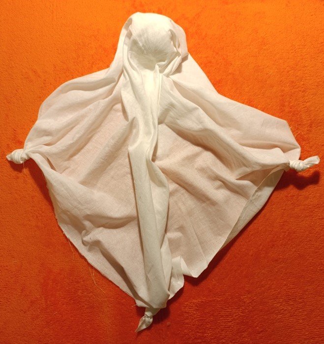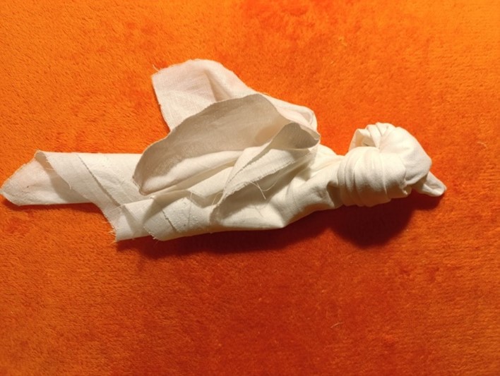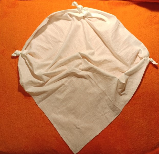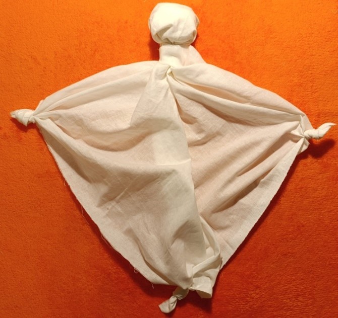 Берем квадрат ткани белого цвета, на трёх концах платка туго затягиваем узелки.