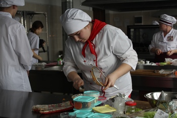 Конкурс состоял из двух этапов: тестирование участников по СанПиНам и выполнение практического задания \”Кулинарный поединок\”, во время которого каждый участник в течении двух часов готовил три блюда – два обязательных и одно на выбор. Все делалось в двух экземплярах: одно блюдо на выставку, второе – жюри на дегустацию.