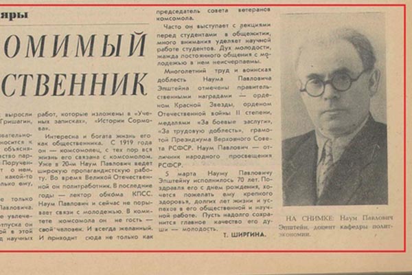 В белорусском городе Чаусы 5 марта 1902 года родился Наум Павлович Эпштейн – ветеран Великой Отечественной войны, Отличник народного просвещения РСФСР, уважаемый и опытный педагог, возглавляющий 25 лет кафедру политэкономии Горьковского государственного педагогического института (сегодня – Мининский университет).