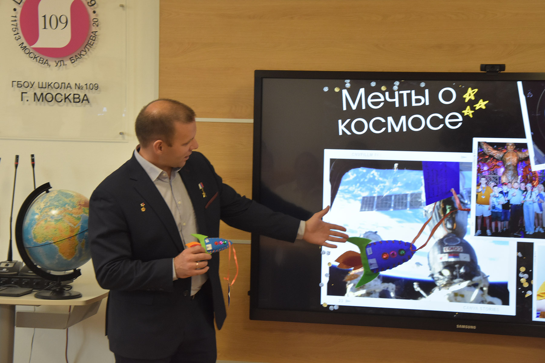 В свою очередь гость передал госпитальной школе тот самый индикатор невесомости, побывавший в космосе. Артефакт теперь займёт почётное место в школьном холле рядом с флажком проекта «УчимЗнаем», который также был на борту МКС в 2017 году.